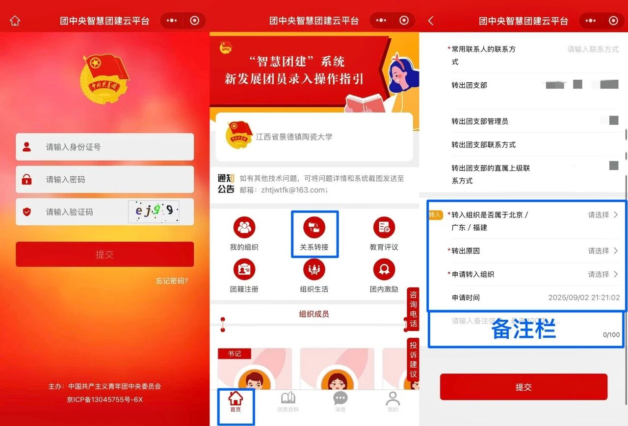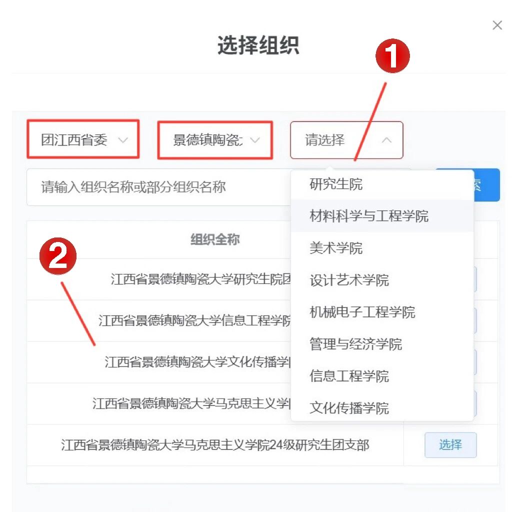 ③申请转入组织:选择组织【团江西省委——景德镇陶瓷大学团委——xxx学院——江西省景德镇陶瓷大学xxx学院xx专业xx班团支部】