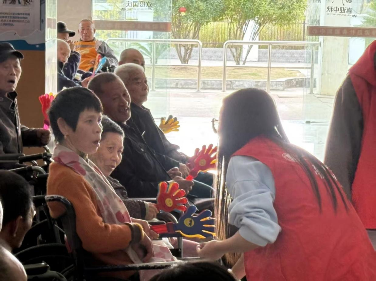 除了暖心陪伴,志愿者们还带来了精彩的才艺表演。清澈的歌声、轻快的舞蹈,引得老人们不时鼓掌叫好。有位老奶奶跟着旋律轻轻哼唱,眼角满是笑意;一位老爷爷拿出手机,认真地记录下这些美好瞬间。夕阳西下,离别时刻悄然到来,志愿者们与老人们合影留念,定格下这段难忘的时光。