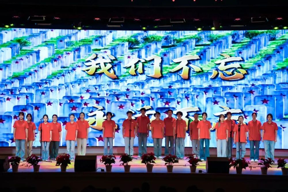 考古文博学院2023级文物与博物馆学专业罗天、机械电子工程学院2023级机械设计制造及其自动化专业王稼丰、设计艺术学院2023级环境设计专业夏振威以《我们在纪念什么》为题,引导广大青年铭记历史、奋发图强。学生合唱团展示合唱歌曲《勿忘》。