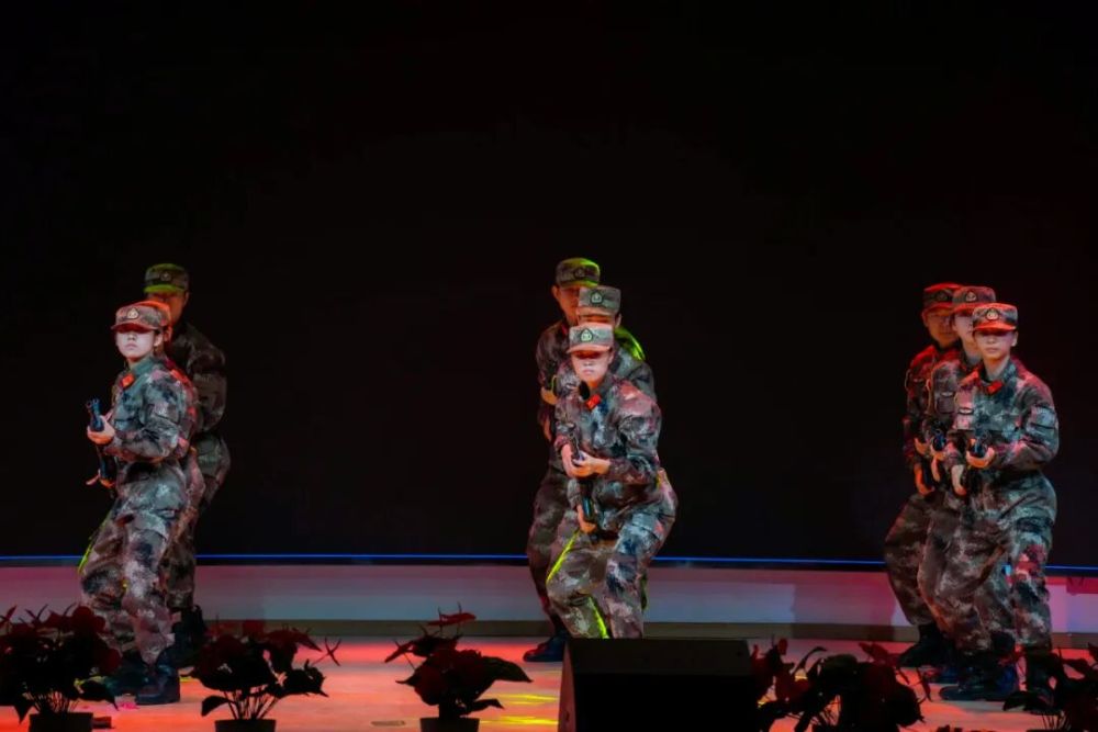 步伐铿锵,动作有力,大学生护校队和国旗护卫队以军体拳、刺杀操展现《军魂》。清晨的升旗、夜幕下的训练、岗位上的坚守,他们始终用青春守护国旗荣耀,用汗水守护和谐校园,以实际行动彰显爱国担当。